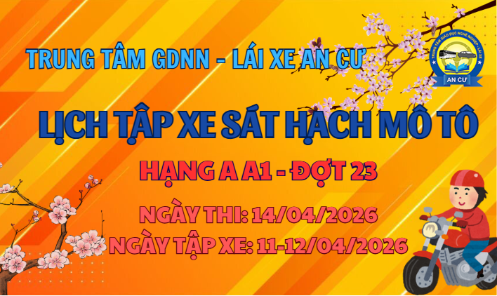 Trung tâm GDNN – Lái xe An Cư xin thông báo đến Quý Thầy/Cô và Anh/Chị học viên: Danh sách dự thi sát hạch Mô tô hạng A A1 Đợt 24(Dự kiến sát hạch đợt đầu tiên trong tháng 5/2026). Theo yêu cầu từ Phòng Cảnh sát giao thông, Quý anh chị có tên trong…