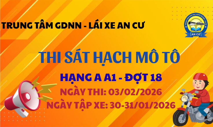 Trung tâm GDNN – Lái xe An Cư xin thông báo đến Quý Thầy/Cô và Anh/Chị học viên: Kì sát hạch GPLX Mô tô A A1 (Đợt 18) sẽ được diễn ra vào Thứ Ba, ngày 03/02/2026. Lịch tập xe: Thứ Sáu, ngày 30/01/2026 & Thứ Bảy, ngày 31/01/2026 (Sáng: 7h30 – 11h Chiều:…